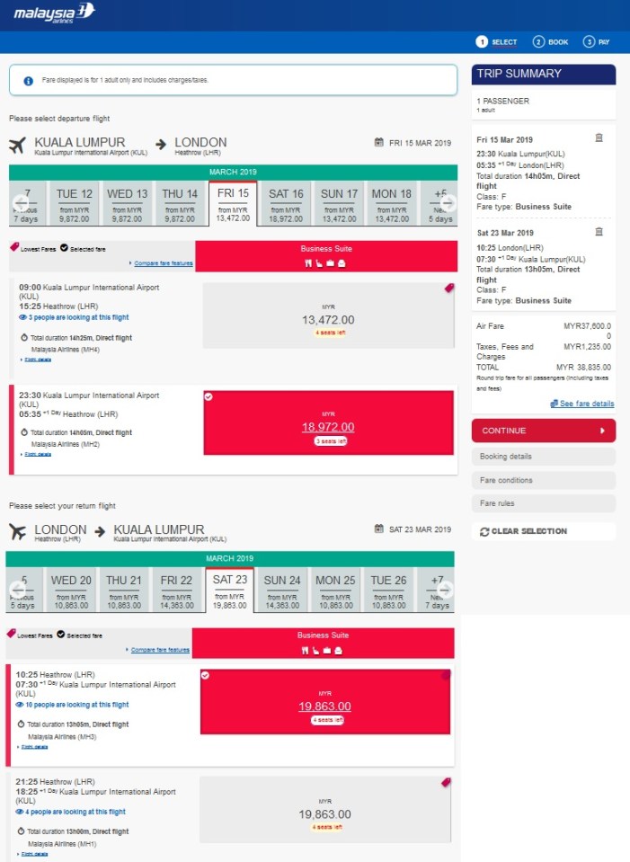 Malaysia Airlines Business Suite Class KL London Price