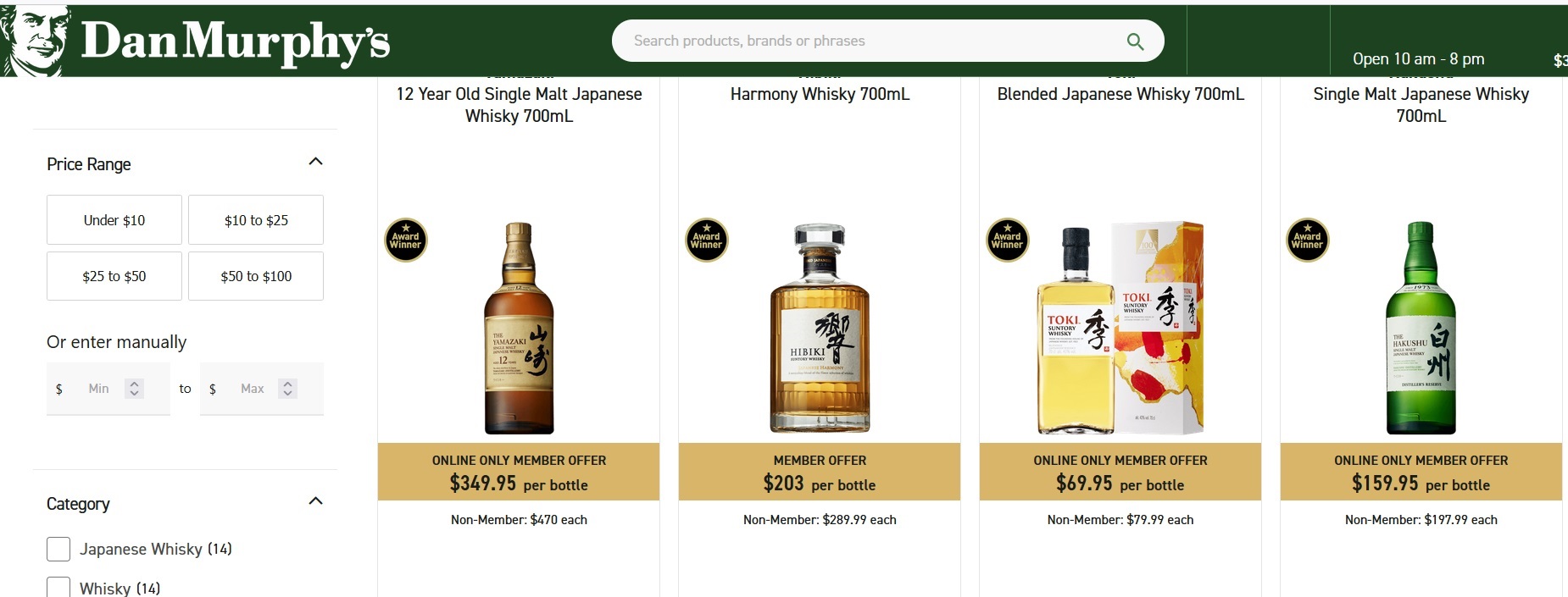 Below is the price of the Hibiki Japanese Harmony at Dan Murphy’s in Australia as of Feb 2024 where it is being offered for AUD203 from normal price of AUD289.99.