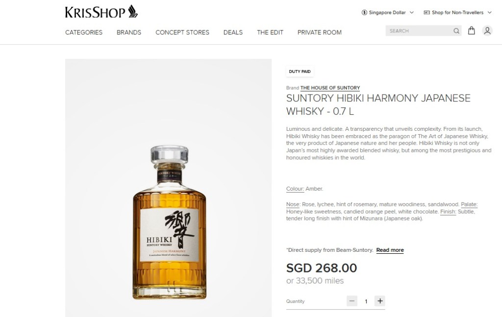 And below is the price of the Hibiki Japanese Harmony (once again it is not the duty-free Master’s Select edition) at KrisShop:
