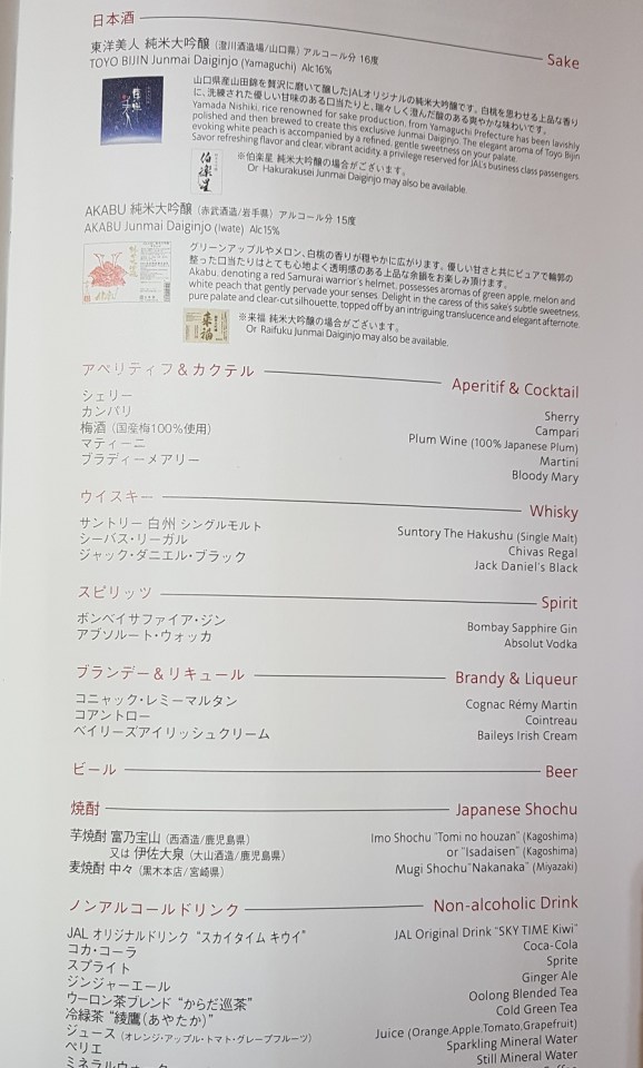Japan Airlines Business Class Menu Tokyo to Melbourne 4