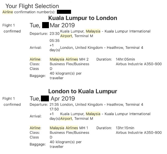 Malaysia Airlines Business Class KL London 2019