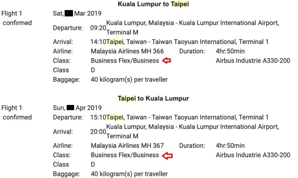 Malaysia Airlines Business Class KL to Taipei March