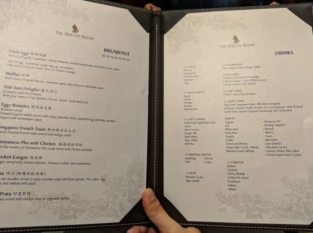 Singapore Airlines First Class Lounge Private Room Changi Menu