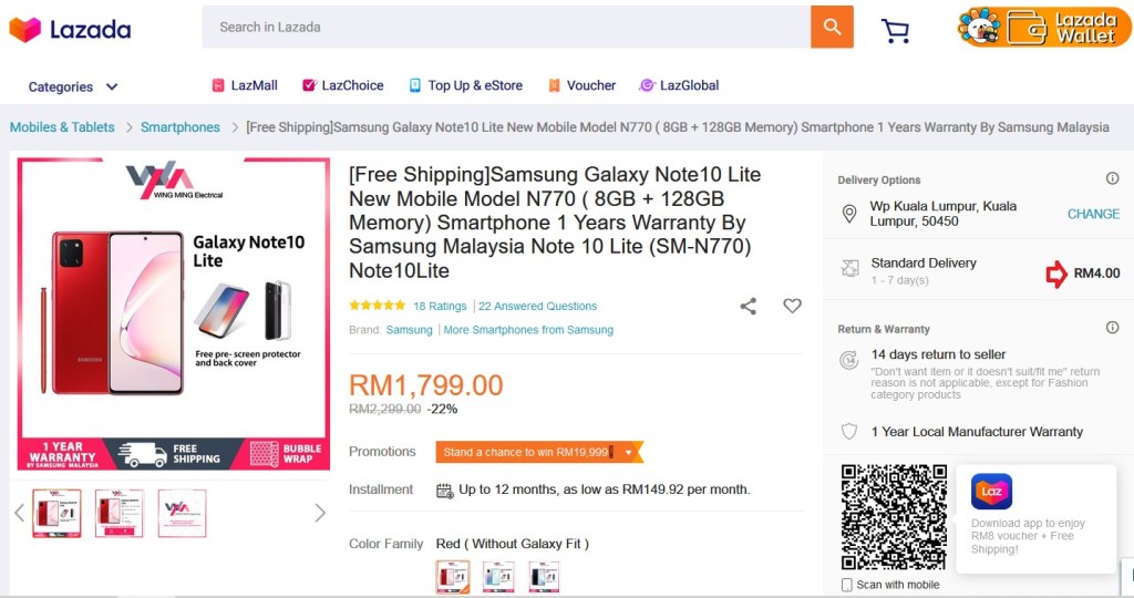 A Bro of mine also taught me how to pay even less at Shopee where a seller is offering the Samsung Note 10 Lite for RM1,799 too.