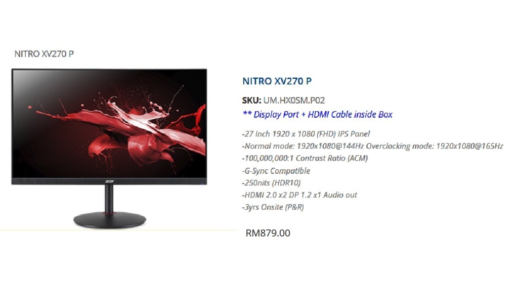 The retail price of the Acer Nitro XV270 P is RM879.
