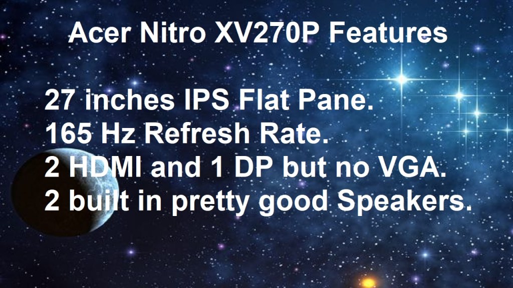 After doing some research here and there, I decided to get the Acer Nitro XV270 P 27″ monitor with FHD (1920x1080p) which comes with IPS panel, which is excellent. It also has 165Hz refresh rate but that depends on many factors to reach this 165Hz.