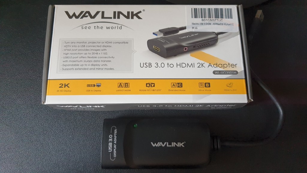 From the very limited but positive reviews at Lazada on the Wavlink USB to HDMI Adapter, I ordered it. It cost RM119 (less than USD40) and took about a week for it to be delivered from China to my home in KL.