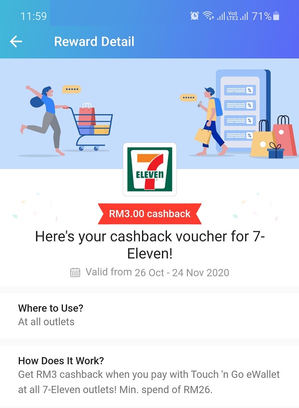 From the above, you can see that in order to use the RM3 Cash Voucher at 7 Eleven, I need to spend RM26.