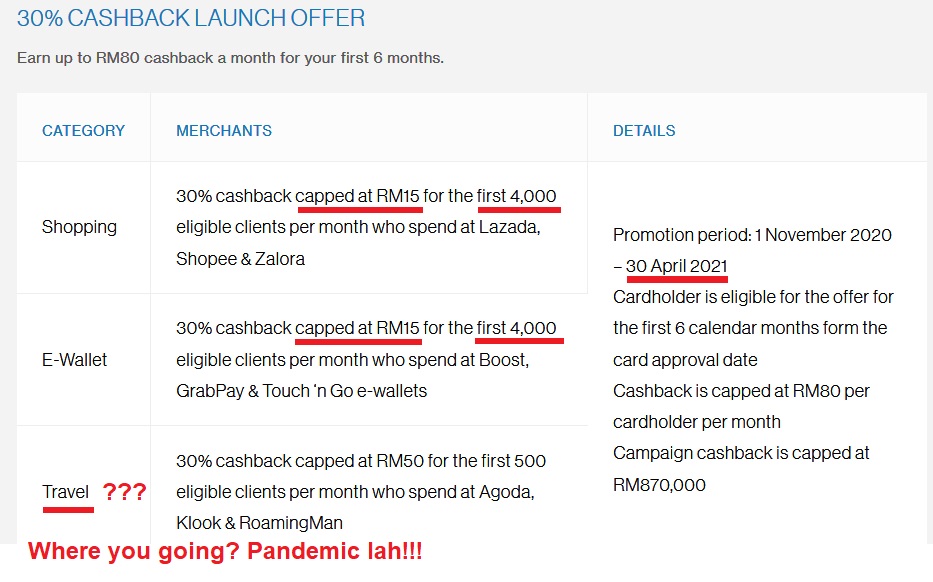 As for the remaining RM80 per month cash back, it is a limited time promo and not guaranteed but based on first come first serve basis for 3 different categories with separate cash back quota!