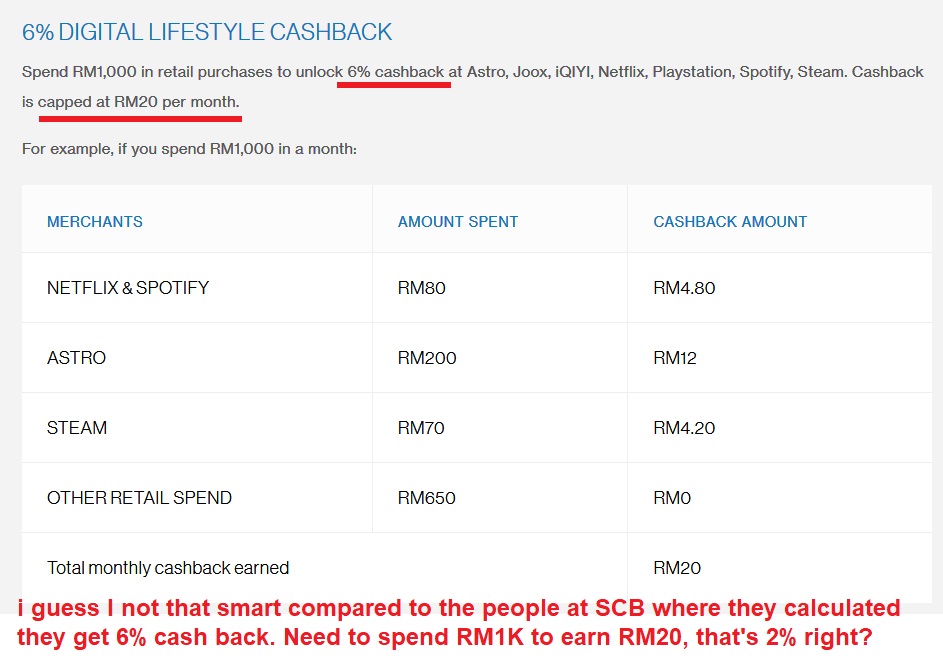Now, in order to earn so called 6% cash back with Astro, Joox, iQIYI, Netflix, Playstation, Spotify and Steam, you need to spend RM1K in total a month with the super SMART Visa! But you only earn max RM20 which means you only earn 2%!!!