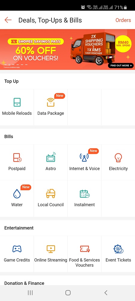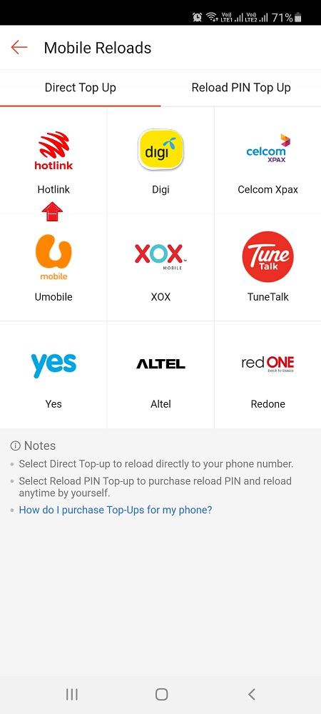 In this example, I tapped on Mobile Reloads but as you can see from the image below, you can also pay bills such as Astro, Unifi, Water and Local Council (limited but if you can pay any one of them it is freaking good).