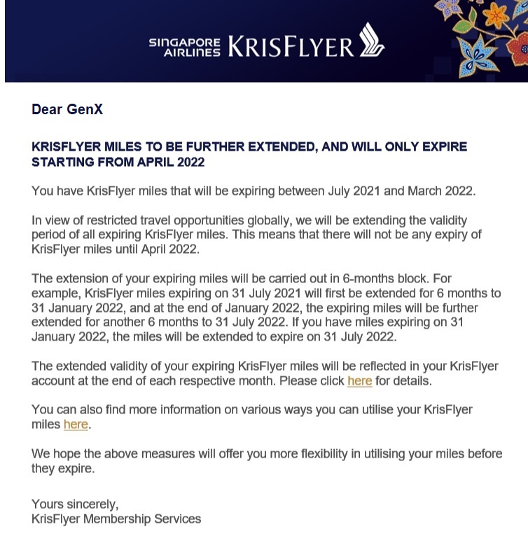 KRISFLYER MILES TO BE FURTHER EXTENDED, AND WILL ONLY EXPIRE STARTING FROM APRIL 2022