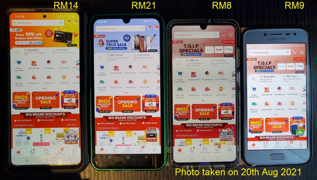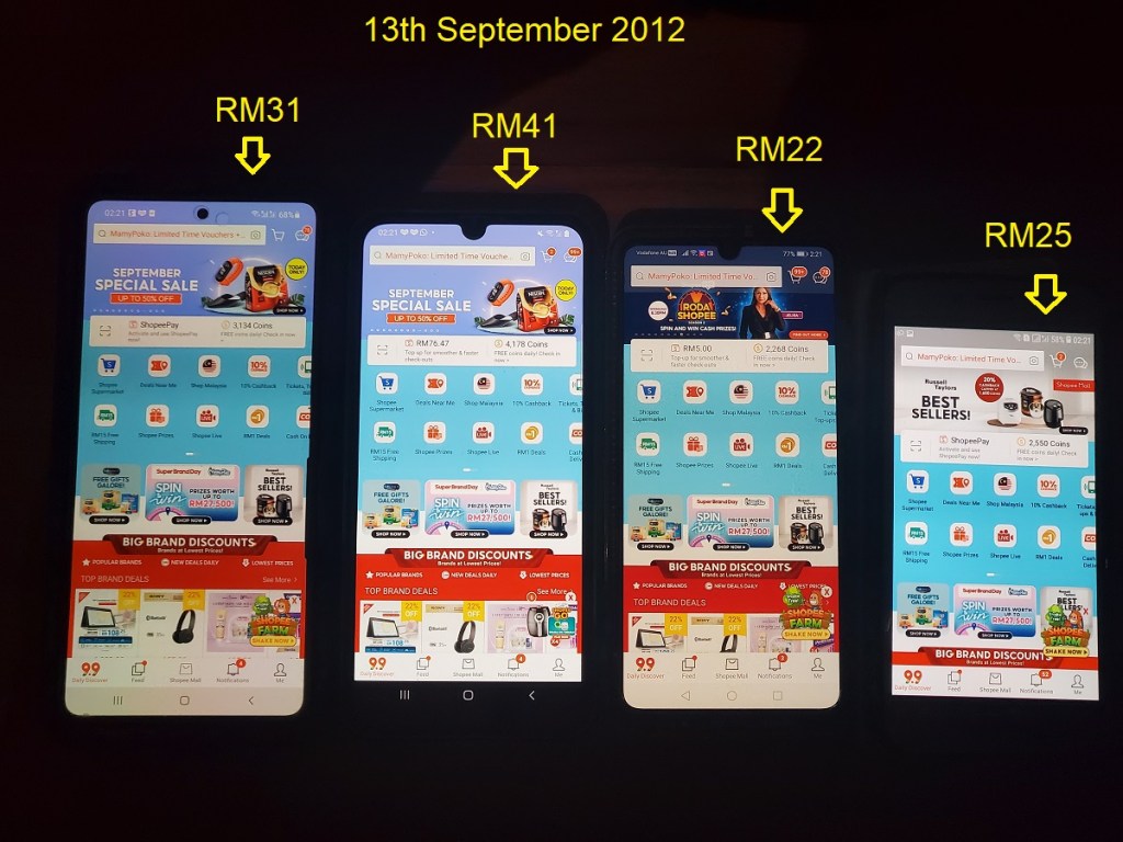 Below photos were taken on 20th Aug and 13th September, about 23 days apart and you can observe that each phone as earned Shopee Coins worth RM15 to RM20 during the said period.