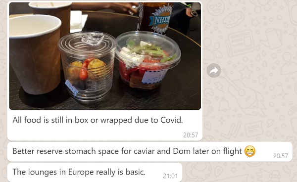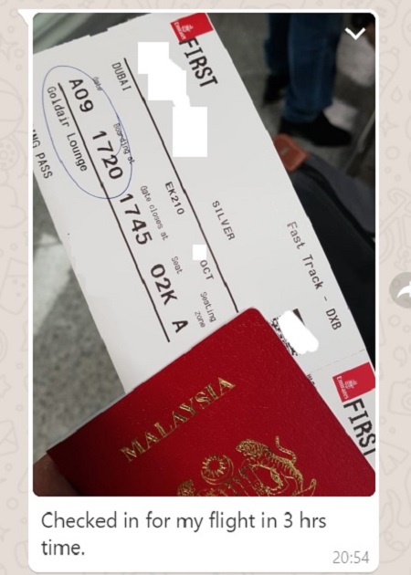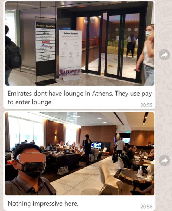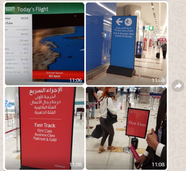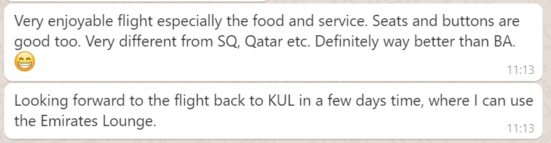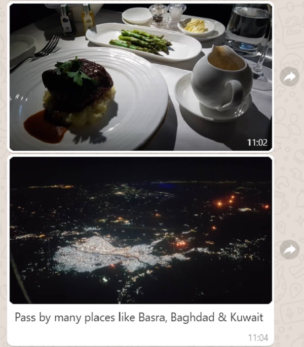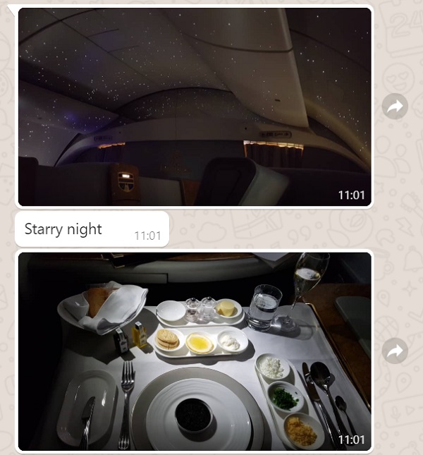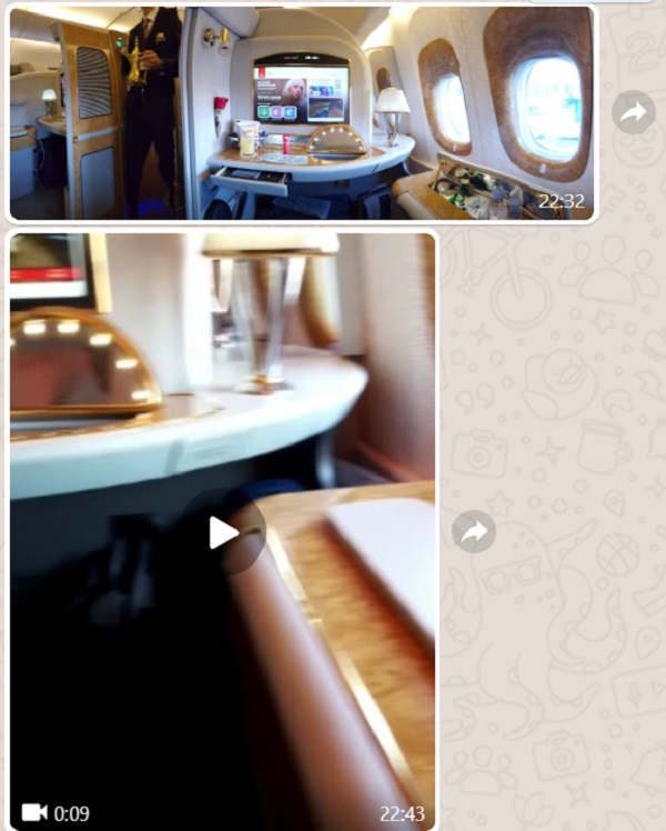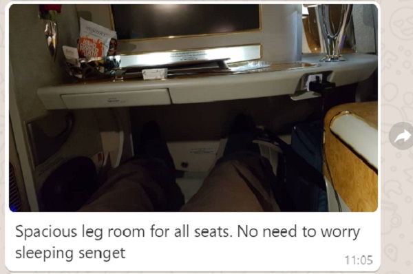 Below is the Bro’s Live Travel Report with Emirates First Class sent to my WhatsApp: