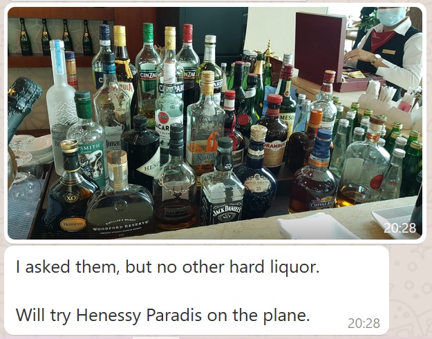 From the above photo by the Bro, I can see that Emirates serve Royal Salute 21 and Hennessy XO. So with Emirates serving Hennessy XO, I give them a big thumbs up and can confirm they have class, haha.