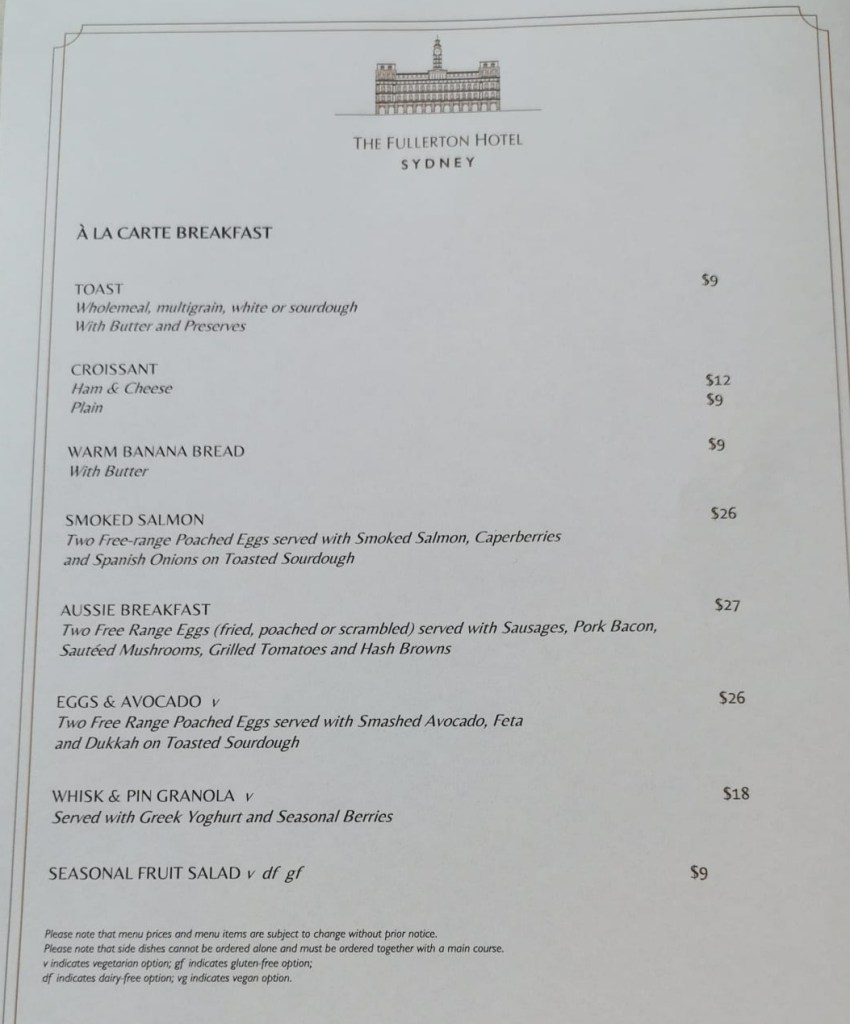 You can book your room with or without breakfast. As of November 2021, The Fullerton Hotel Sydney is once again offering Breakfast Buffet (image above).