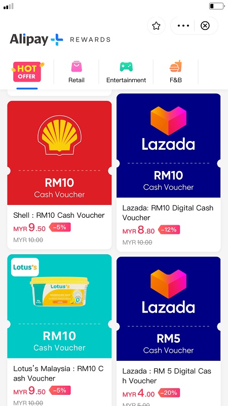 From the above, it is observed that we can get 5% cash back for RM10 Shell Voucher and up to 12% cash back for Lazada.