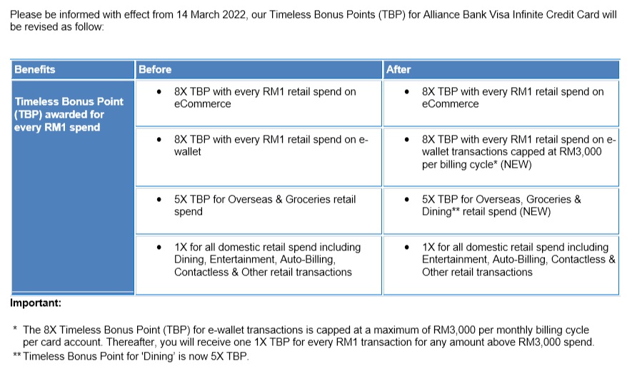 In respect to the above, the main revision is that the 8X Timeless Bonus Point (TBP) for e-wallet transactions is capped at a maximum of RM3,000 per monthly billing cycle. In other words the Alliance Visa Infinite and Visa Platinum is still good for topping up eWallet BUT only up to RM3K per month!