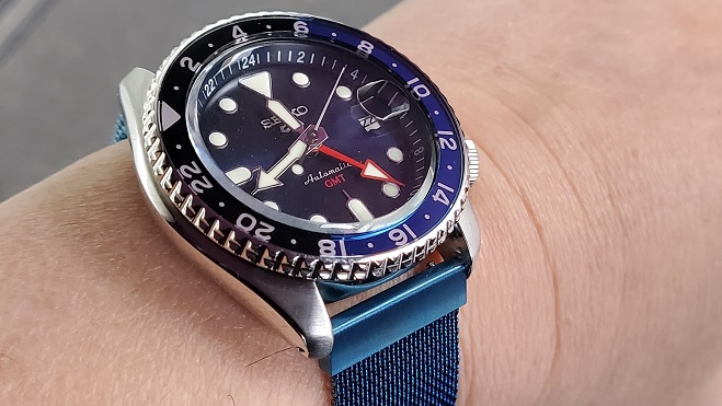 In order to give you a better comparison between the Seiko 5 GMT versus the Rolex GMT, I decided to produce a video which will allow you to have a better “feel” and also see the mechanism, i.e. the bi-directional bezel, how the 2nd 24 hours hand is adjusted when you turn the crown clockwise and the date when you turn it counter-clockwise. And when I replaced the Malinese Blue Strap, the watch was transformed to a more beautiful watch and 40g lighter.