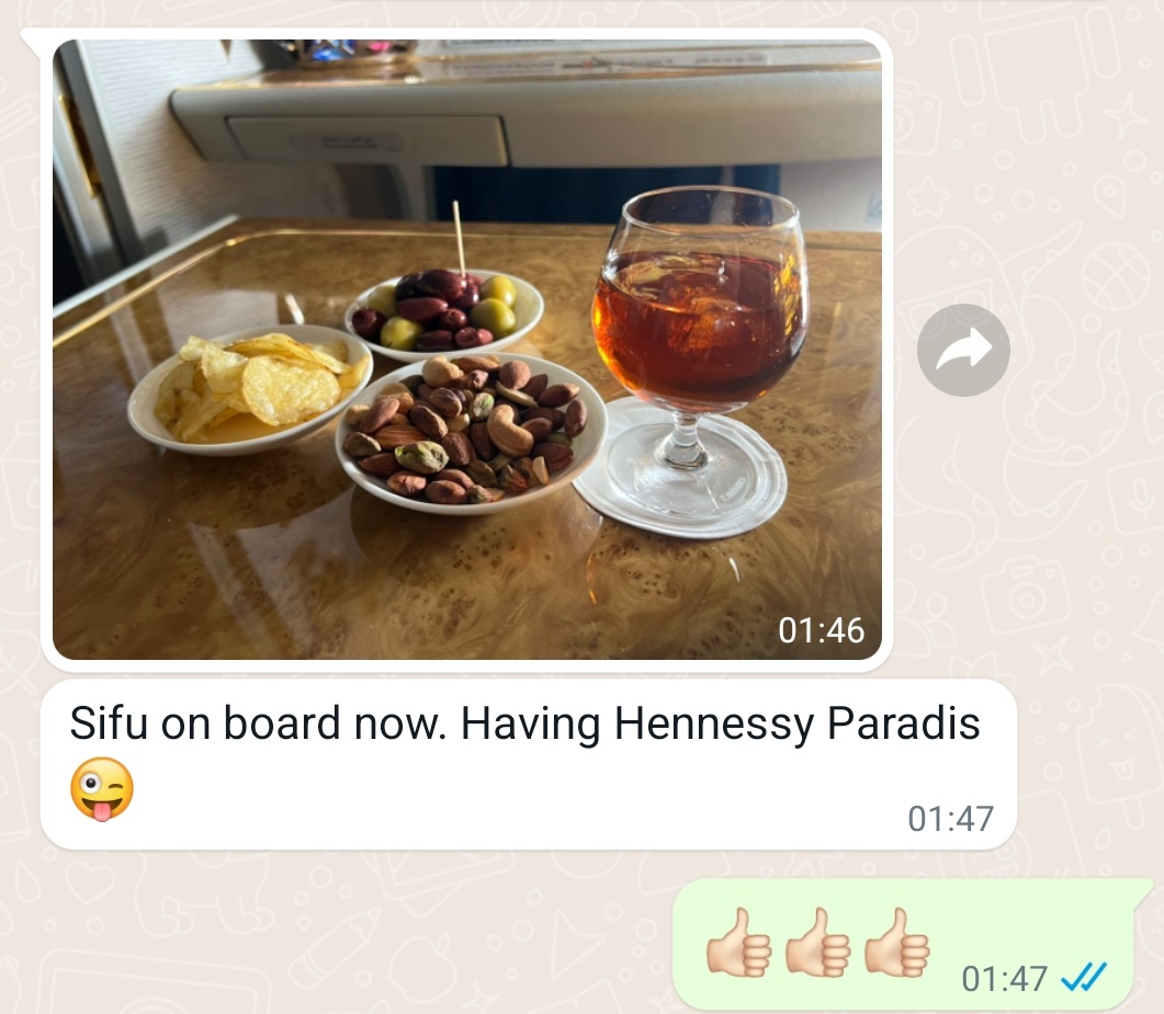 Previously he flew on the Emirates Boeing 777 NEW Suite but he did not order the Hennessy Paradis but I have told you all, the Emirates First Class experience is incomplete if you do not try the Heneessy Paradis for FREE, haha.
