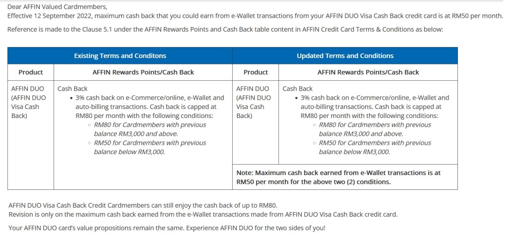 Now the bad news, effective 12th September 2022, the cash back for topping up eWallets with your Affin Duo Visa is capped at RM50 per month!