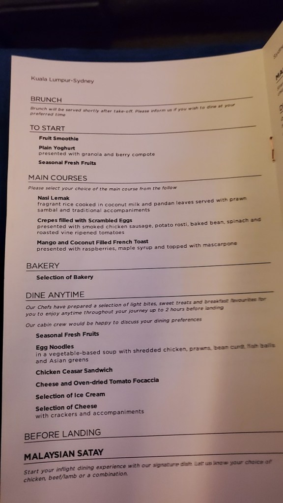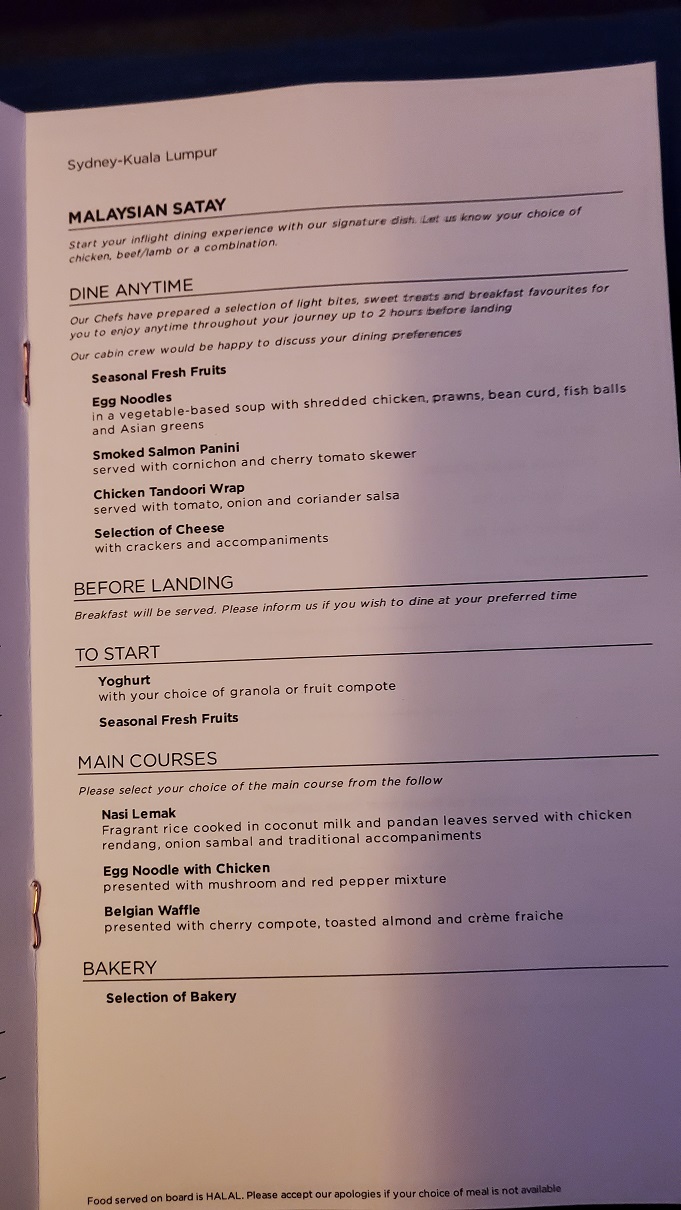 After take off and reaching the cruising altitude, we were served Satay and whatever we want from the Dine Anytime Menu but I just took the Satay. The flight Supervisor offered me more food after the Satay but declined as I wanted to go to sleep and told him to wake me up for Nasi Lemak.