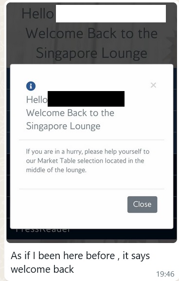 It was the first time the Sis visited British Airways Lounge in Singapore but the message she received stated Welcome Back, hahaha.