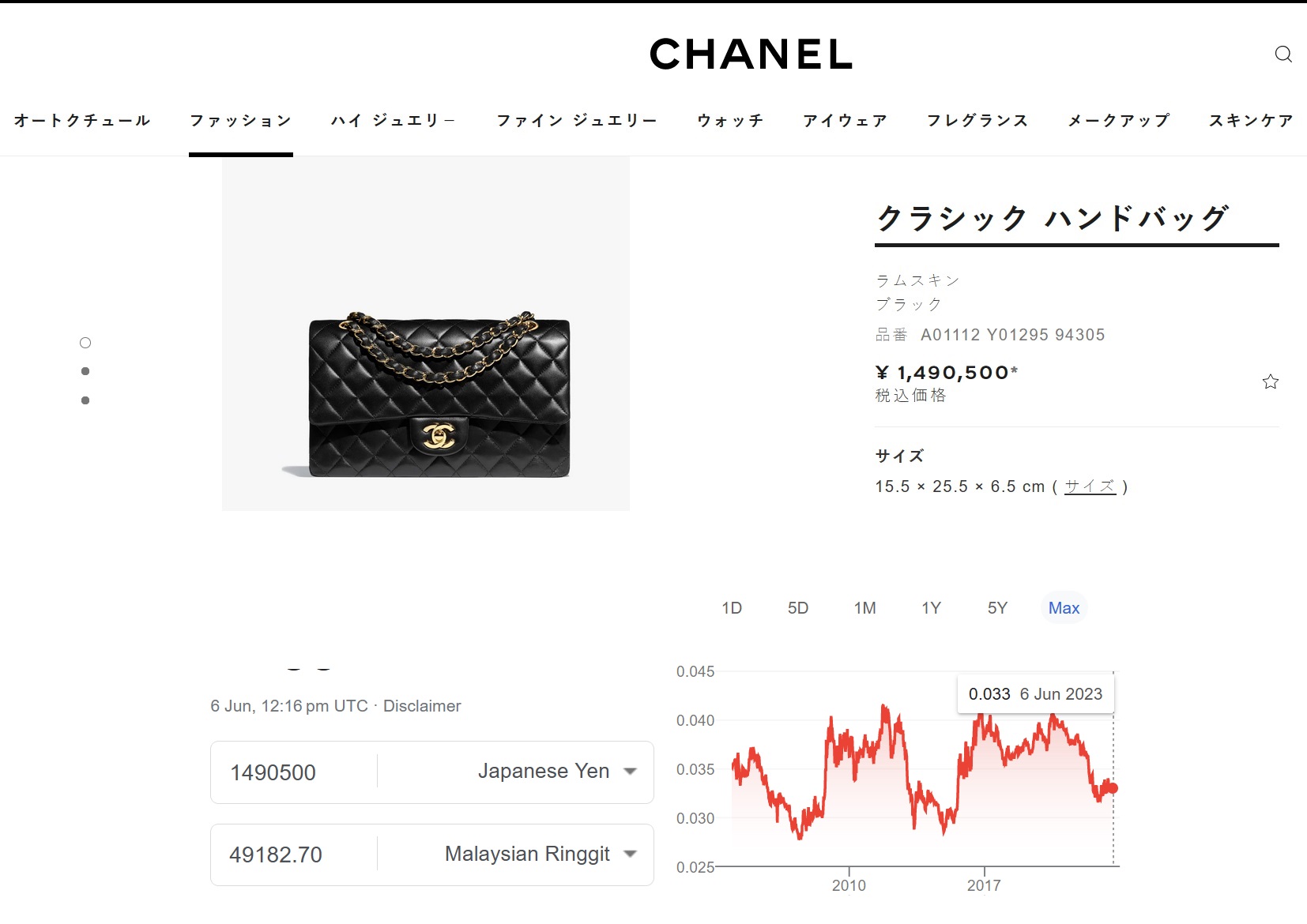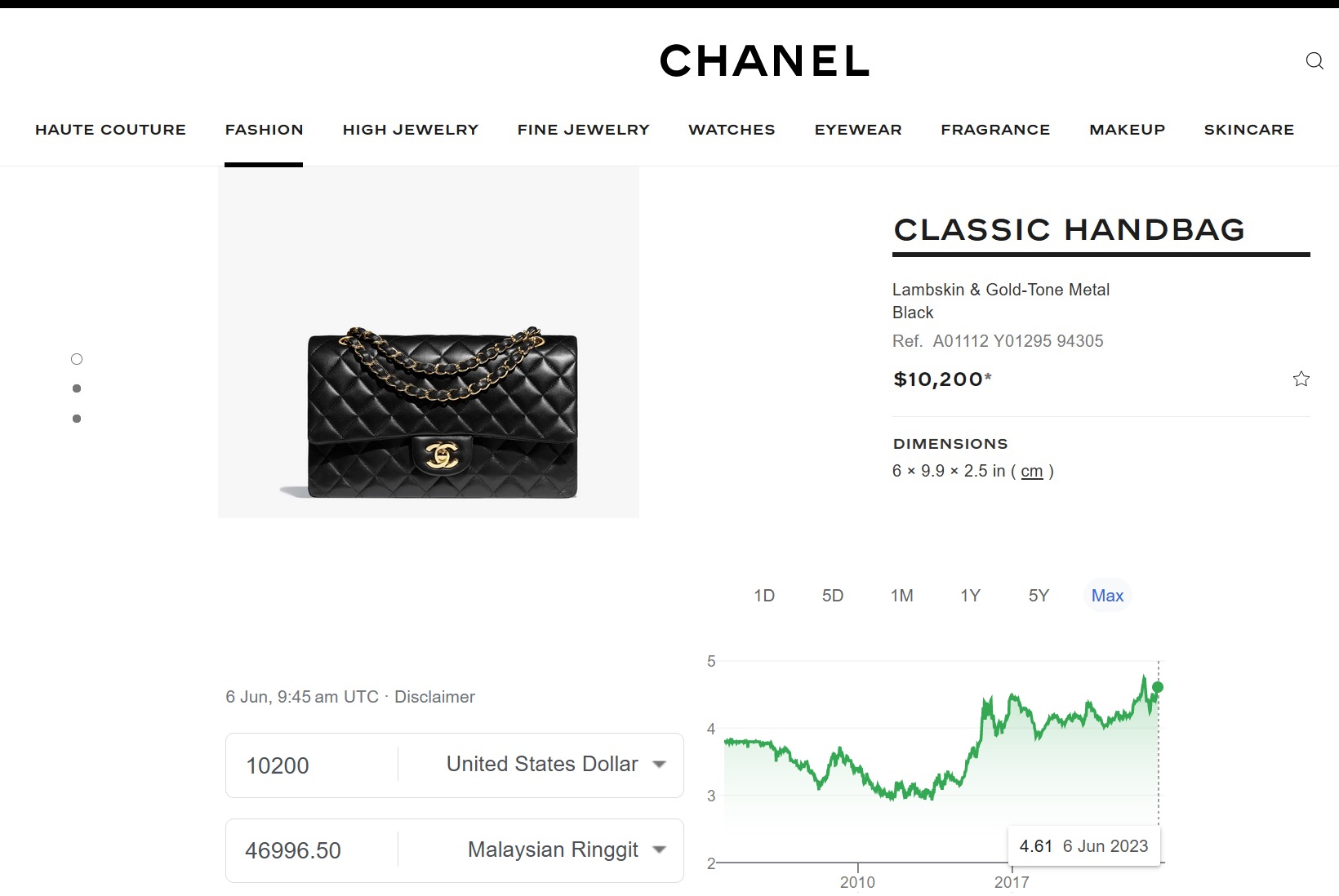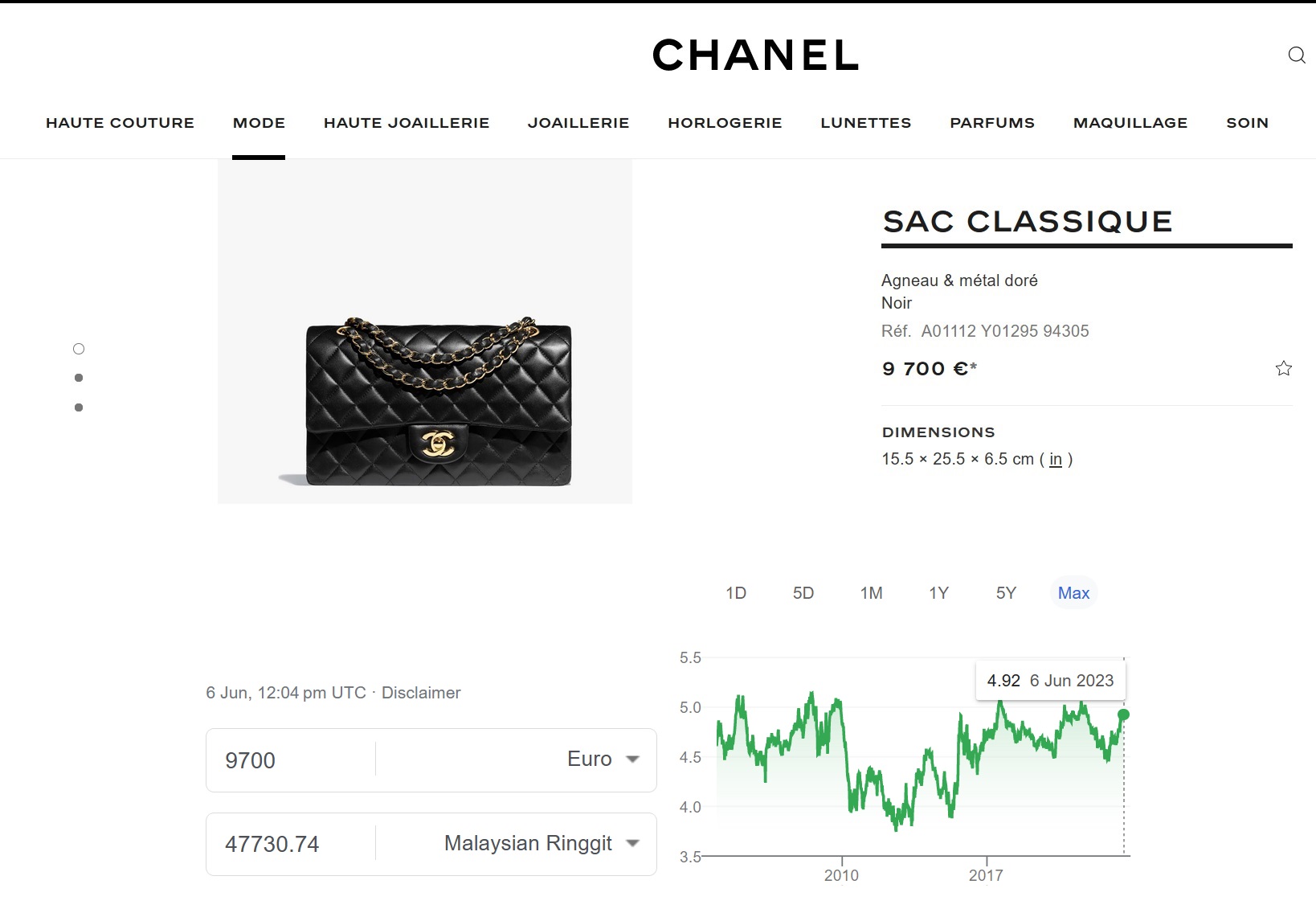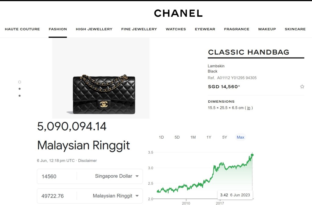 Chanel has been increasing the price of their handbags at least twice a year since 2020. Now with Chanel increasing their prices COUPLED with the weakening Ringgit, the price of Chanel Handbags will increase much more compared to other countries. However, if our Ringgit strengthens, then Chanel products will be cheaper for those of us who own Ringgit; but based on historical data, you tell me lah in the long run will our Ringgit strengthen? Just look at the chart above for Thai Baht and Sing Dollar versus MYR.