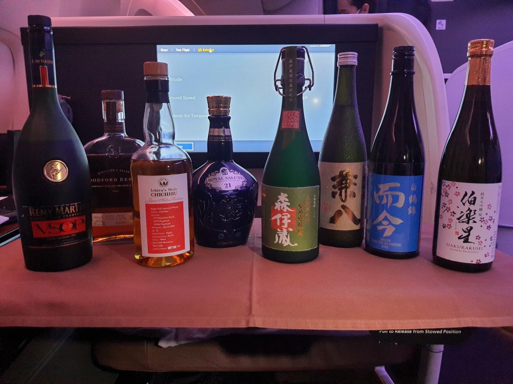 Below Japan Airline First Class (London to Tokyo) liquor and spirits – no XO but VSOP!!!