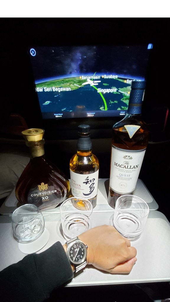 Below Singapore Airlines Biz Class to Australia – they still serve Courvoisier XO for Biz Class on the plane and at their Lounge. The Chita and Macallan Quest or not expensive but easy to drink.
