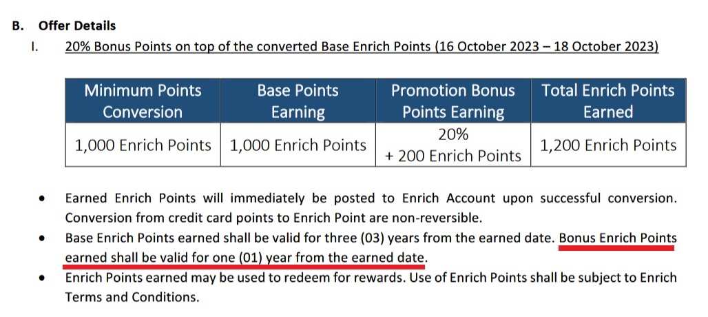 From the above, if you convert your Credit Card Reward Points to Enrich Points on 16th October until 18th October 2023, you will earn 20% Bonus Enrich Points. From 19th October you will only earn extra 10% Bonus Enrich Points.