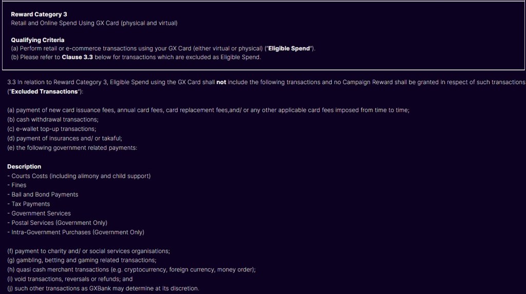 Actually, the GX Bank Debit Card is worse than the HLB Essential Visa! Below are the TnC for the GX Bank Debit Card and you will notice that Insurance Payments are also excluded from earning Cash Back!!!