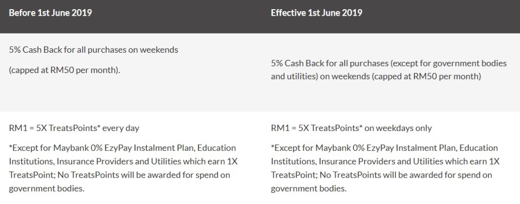 A. 5% cash back on weekends (Saturday and Sunday) for all types of transactions except for Government, eWallet (this means Grab Wallet, Lazada Wallet and Shopee Wallet) and Utilities. Now please differentiate between topping up Grab Wallet, Lazada Wallet, Shopee Wallet and other eWallet versus using your Maybank 2 Cards Gold/Platinum AMEX to pay directly for Grab Rides, Grab Food, Lazada and Shopee to where you do earn 5% cash back on weekends.