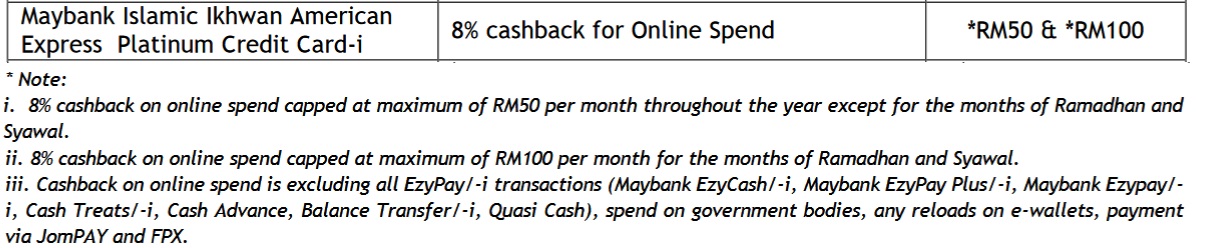 This Maybank Islamic Ikhwan American Express Platinum Card-i is good for Online Transactions only AND based on the information in the Disclosure Sheet, this card is also excellent for Education, Utilities and Insurance. Maybe not Education as the amount we can spend with it is limited in view of the cash back capped at RM100/month and RM50/month only.