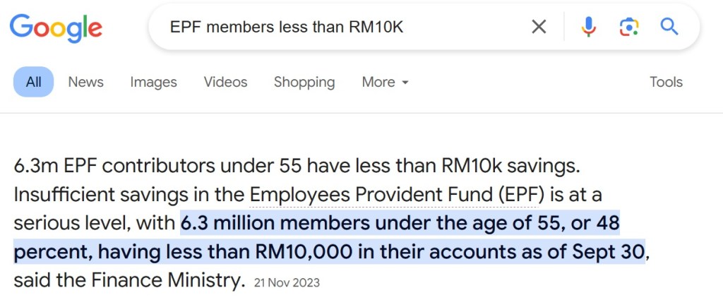EPF was designed for retirement and we all know lah from the many past reports that many have less than RM10K in their EPF. Below was a report only in 2023:
