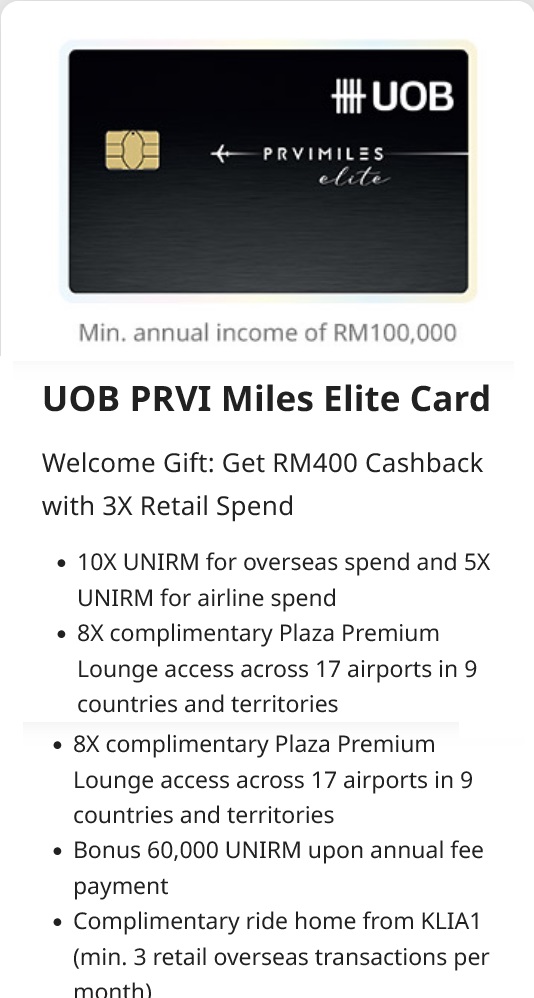 Liked I have mentioned many times previously, UOB credit cards actually earn us more air miles per Ringgit spent overseas compared to the Maybank 2 Cards Premier. I will touch on UOB PRVI Miles Elite Card in this article but you can also look into UOB Zenith and UOB Visa Infinite based on your spending pattern.