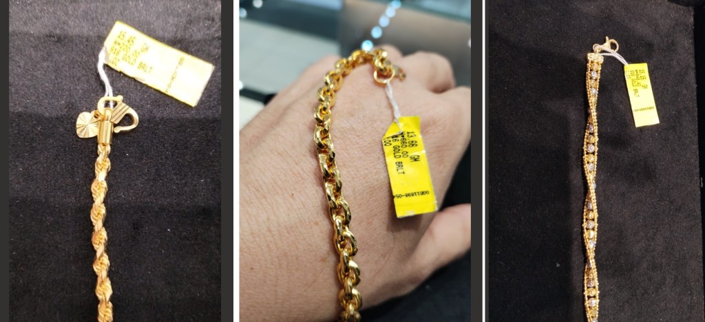But then I started to think to myself, these “Kwai Loh” brands are so overpriced as the weight of the gold is no where near the price of gold I am paying. So I WhatsApp my jeweler in KL and asked him what yellow gold bracelet I can get for around RM4K to RM6K. Below are the bracelets he sent to me in less than 30 minutes: