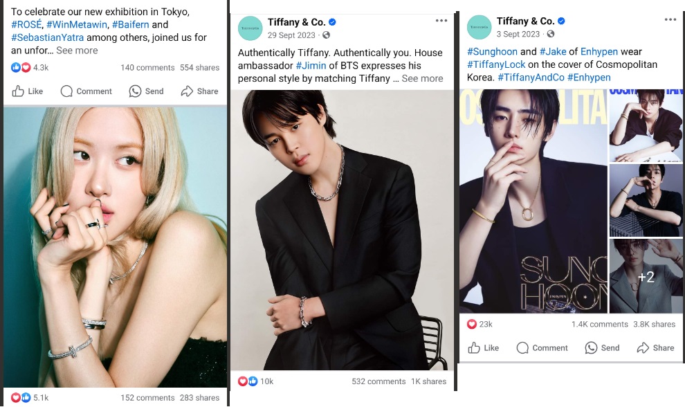 My wife told me that nowadays the younger generations are influenced by K-Pop or K-Drama celebrities where jewelers like Tiffany & Co, Cartier and Van Cleef & Arpels amd even Hermes engage them as brand ambassadors. And whenever a piece of jewellery or handbag appears in a K-Drama, it will cause a sudden demand. Below are some examples of Asian celebrities being ambassadors to Kwai-Loh companies: