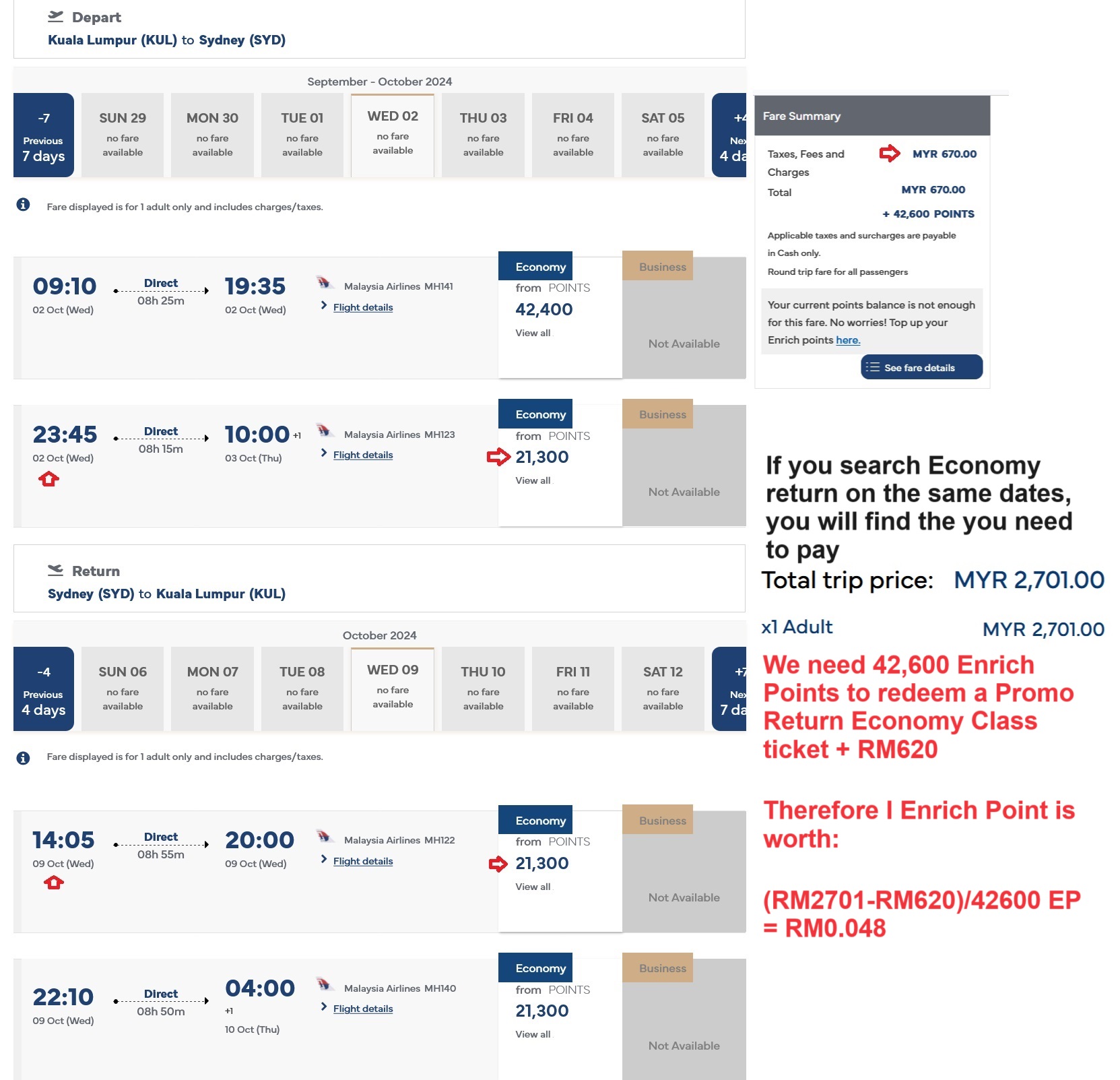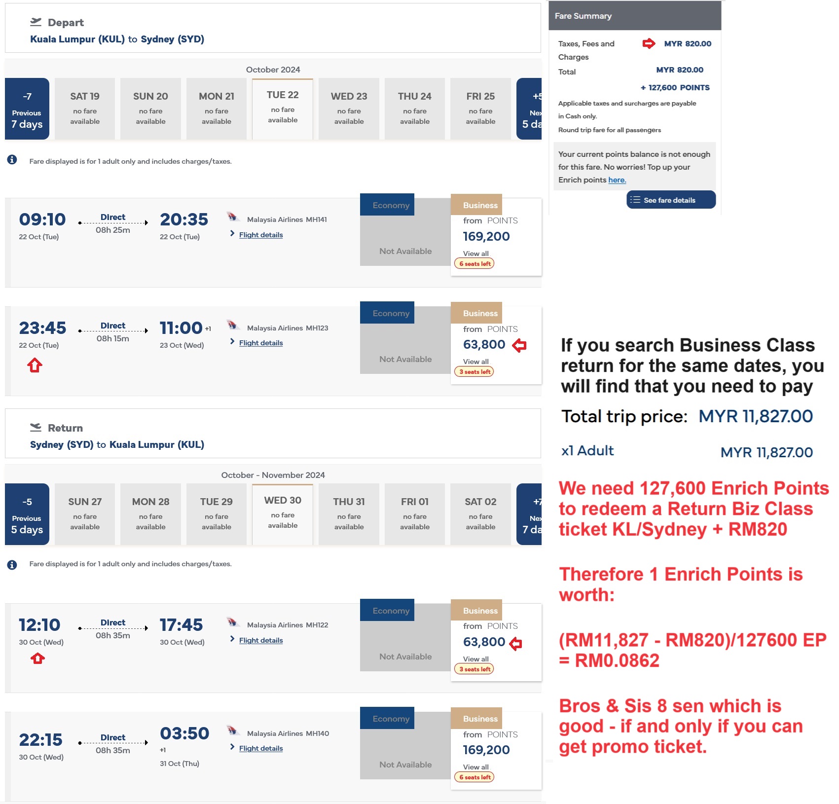 Below is another example where I managed to find return KL/Sydney for Business Class in October 2024 (Off Peak). Once again, if you can find a Promo Enrich Points tickets then it is very good.