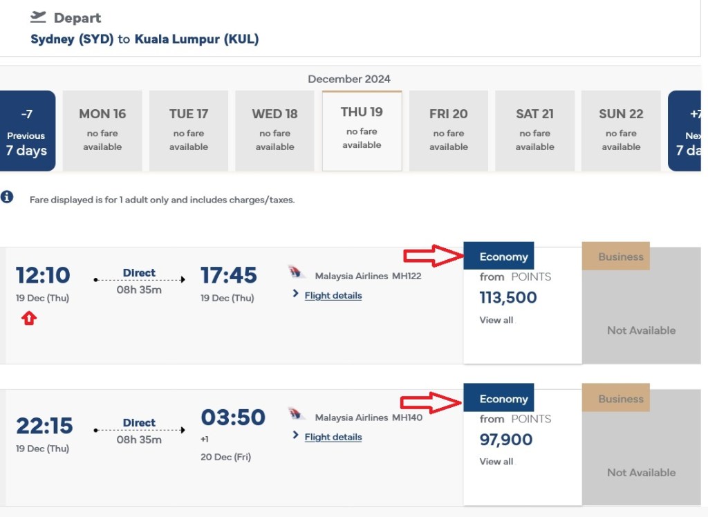 Example No.1: You may get a Promo Enrich Business Class Ticket Kuala Lumpur to Sydney in December 2024 with 63,800 Enrich Points but look at the number of Enrich Points you need to redeem a Business Class ticket Sydney to KUL in December!