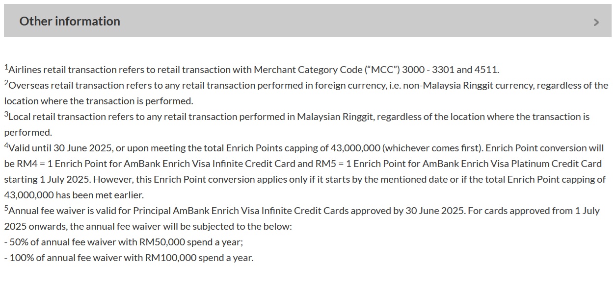 It is quoted that the AmBank Visa Infinite and Visa Platinum earns you 1 Enrich Point for every RM3 and RM4 respectively until 30th June 2025.