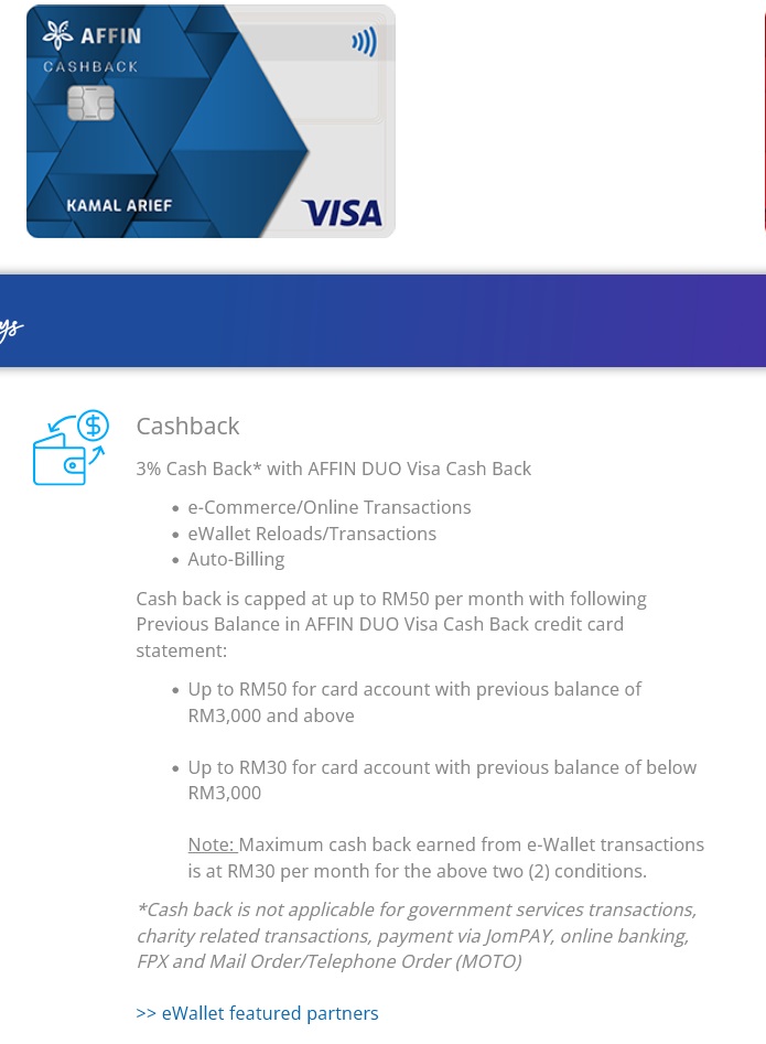 But I am only going to recommend the Affin Duo Visa as it is a Cash Back Credit Card which earns you cash back for topping up eWallets! So once again do not activate the MasterCard is you are not going to use it.