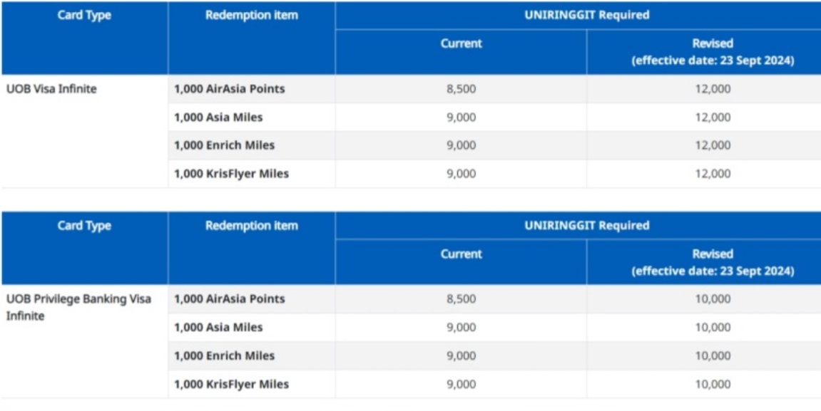 However, when redeeming for air miles, the UOB Privilege Banking Visa Infinite need 20% less UNIRinggit compared to the non-exclusive UOB Visa Infinite.