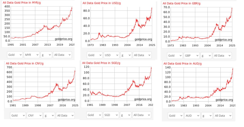 FYI, spot gold is traded in USD, therefore if USD strengthen against MYR, then gold will be worth more if the spot rate remains constant. Like wise, if MYR strengthen against USD and gold spot rate remains constant, then gold price in MYR will drop! But because gold is traded in USD, basically today gold can be converted to any currency and that is why you can convert your physical gold to cash anywhere on earth.