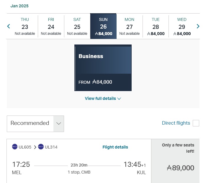 From my experience, I know Asia Miles there may be a chance to get a Biz Class ticket with Malaysia Airlines last minute. So I started my search with AsiaMiles. Below is an example of the results I got today while drafting this article (18th January 2025).
