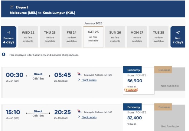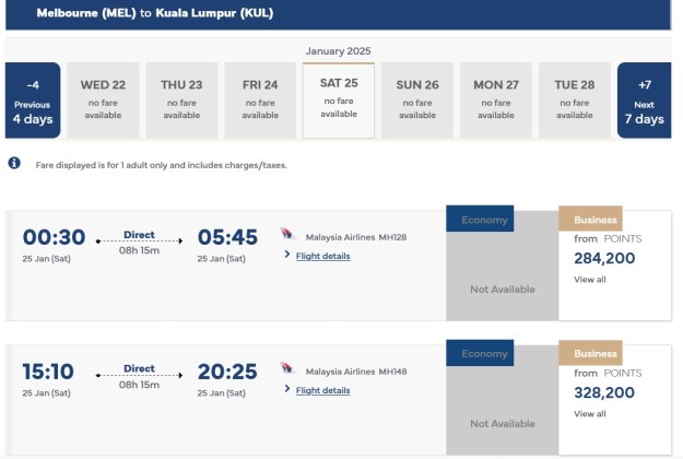 Asia Miles Kuala Lumpur to Melbourne early February 2025