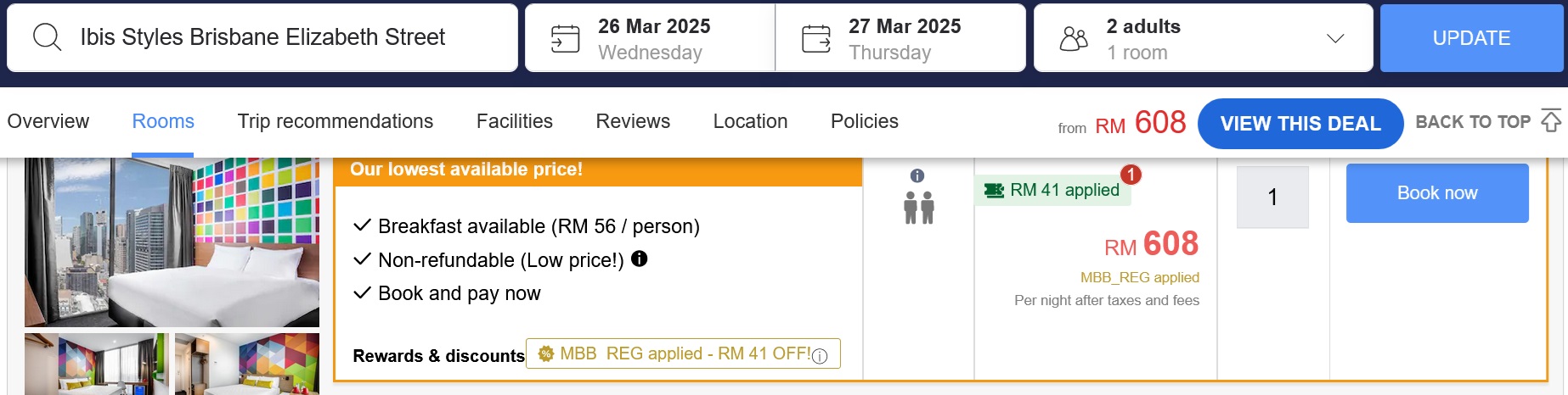 From the image below, the cheapest room at Hyatt Queen Street Mall Brisbane will cost is RM874 per night on 26th to 27th March 2025. Please note the price may have not included discount for Maybank credit cards.