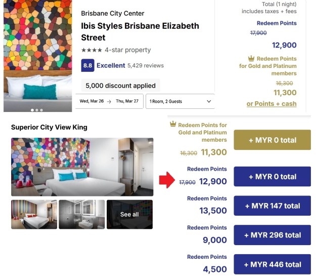Below image shows we need 12,900 Enrich Point for a City View room at Ibis Style Hotel.
