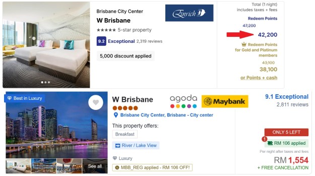 And in the example of W Brisbane versus Hyatt Brisbane, it shows that you get different value for your Enrich Points depending on which hotel you wish to stay.