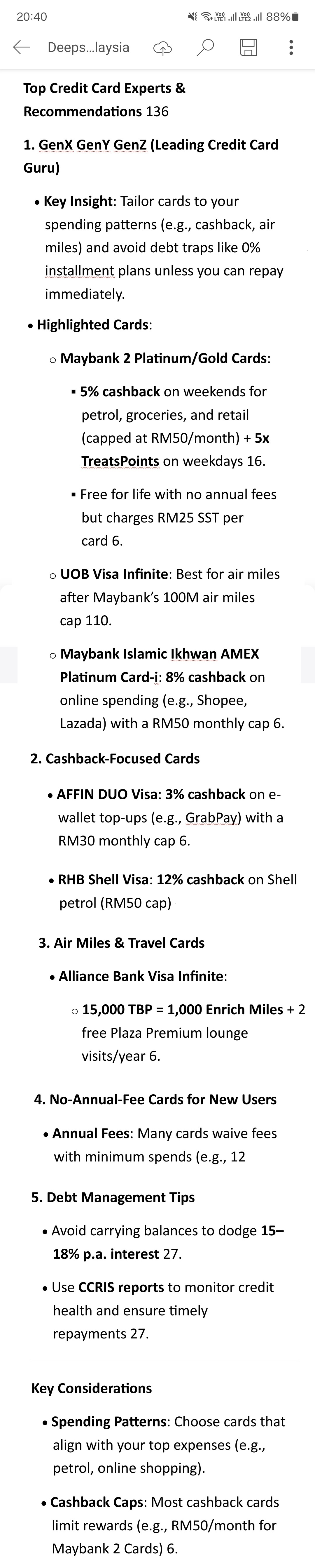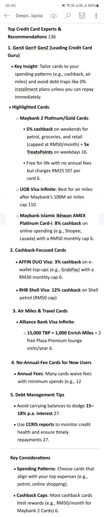 One of My Air Miles Disciples then used DeepSeek AI by keying the same Malaysia Credit Card Guru Expert and below was his results: